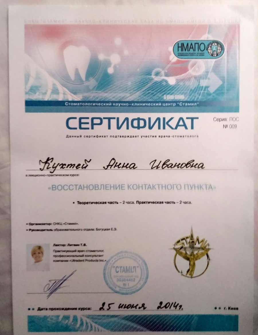 - 2014 Відновлення контактного пункту та ізоляція робочого поля. Навчальний центр «Стаміл». Лектор: Литвин Т.В.;