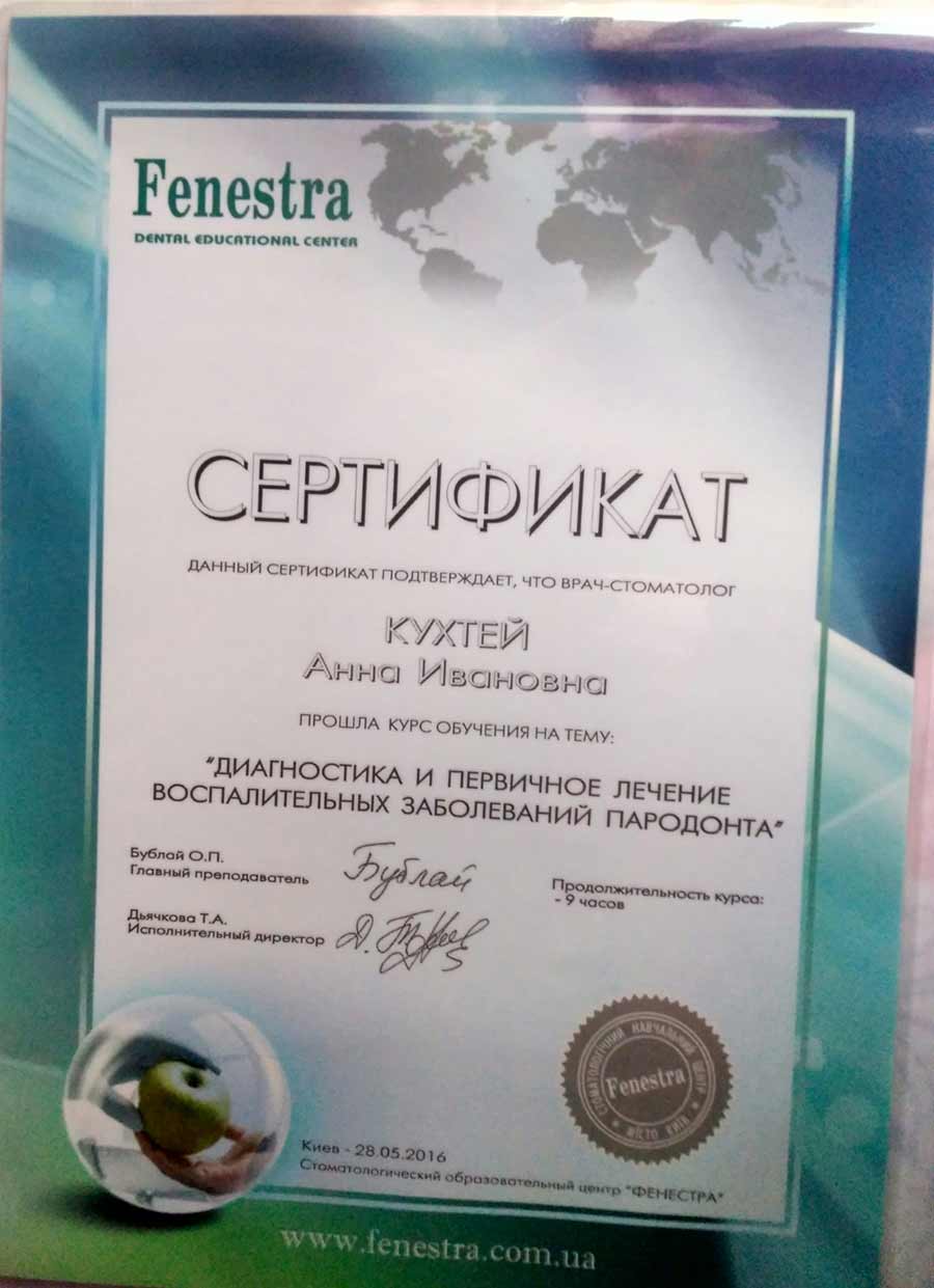 - 2016 “Діагностика та первинне лікування запальних захворювань пародонту”» Навчальний центр “Fenestra”.